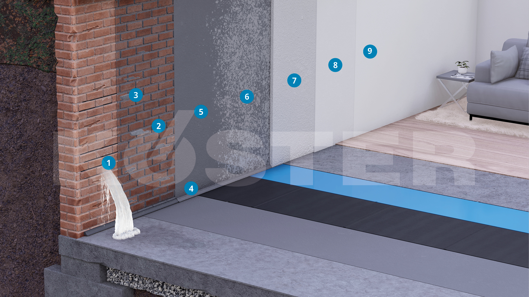 In the case of damage to basement walls caused by moisture, KOSTER Restoration Plaster should be applied. KOSTER Restoration Plasters are specially designed for the restoration of masonry with high salt and moisture contents. KOSTER Restoration Plasters help to dry out the wall and absorb remaining salts. They do not contain lime or gypsum, are open to water vapor diffusion and create a healthy and comfortable room climate.