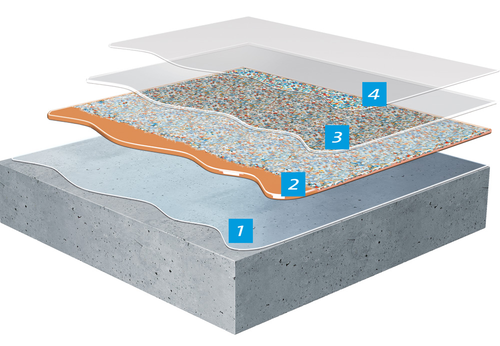 KOSTER Chip and Quartz Floor Systems are epoxy-based broadcast floor systems that incorporate different kinds of broadcast media such as colored chips or colored quartz. Both systems are versatile in design, easy to clean, seamless, durable, and slip resistant while being cost-effective. Both systems can be coated with a urethane based topcoat to enhance scratch resistance and UV stability.