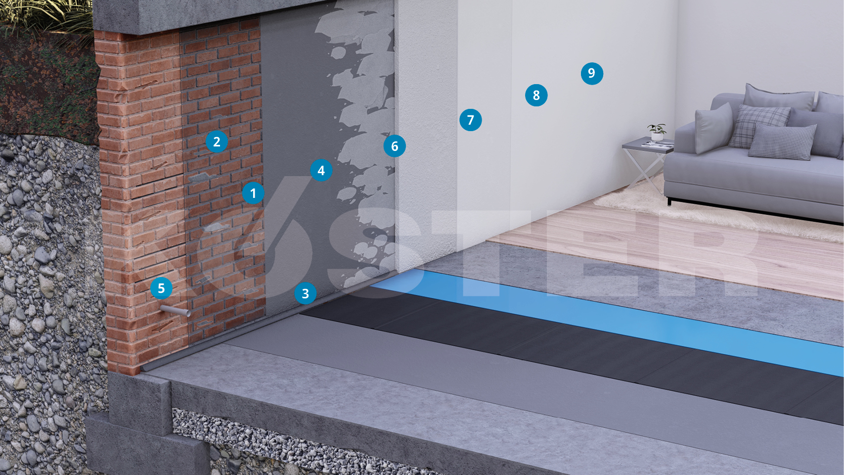 In the case of damage to basement walls caused by moisture, KOSTER Restoration Plaster should be applied. KOSTER Restoration Plasters are specially designed for the restoration of masonry with high salt and moisture contents. KOSTER Restoration Plasters help to dry out the wall and absorb remaining salts. They do not contain lime or gypsum, are open to water vapor diffusion, and create a healthy and comfortable room climate.