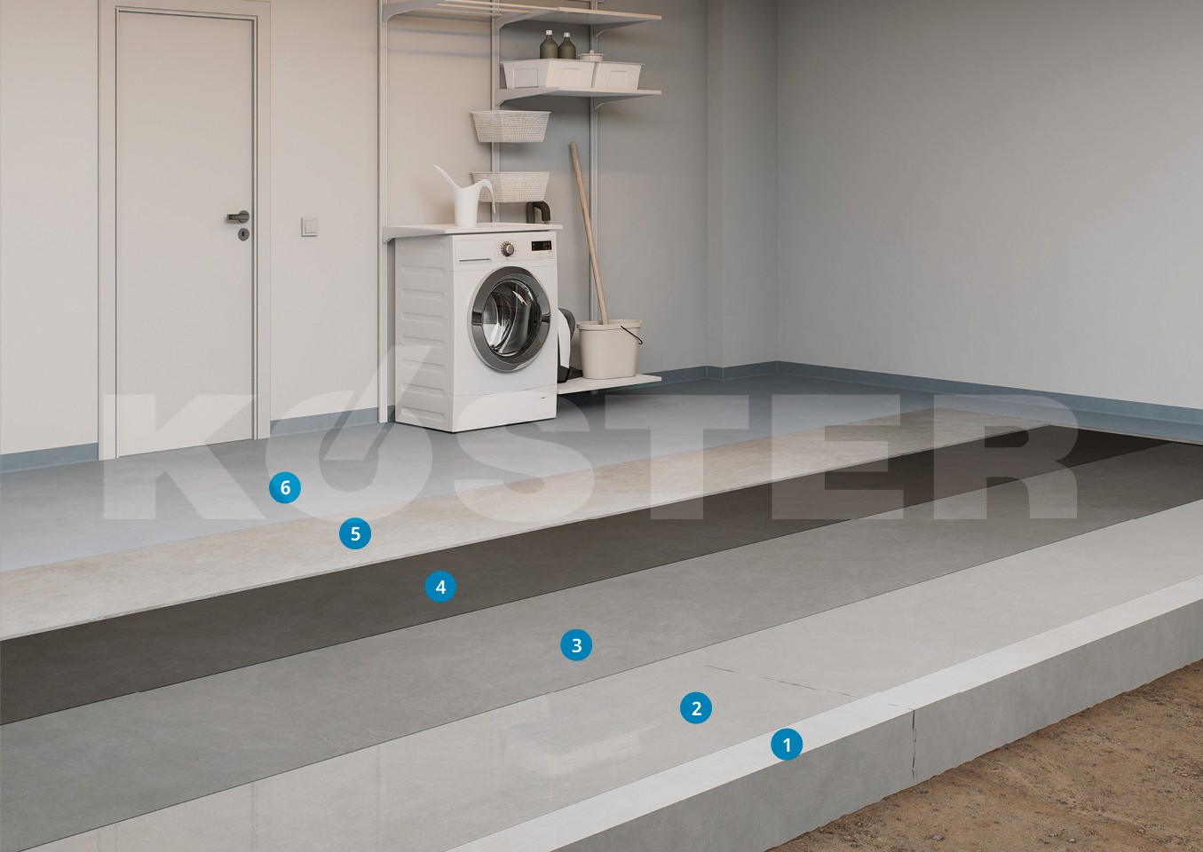 The waterproofing system for a self-leveling floor begins with the surface preparation of the concrete substrate. Initially, the prepared substrate is primed with KÖSTER Polysil TG 500, which hardens the substrate and reduces the mobility of salts. Once primed and cured, a two-layer application of KÖSTER NB 1 Grey waterproofing slurry follows, (2 x 1.5 kg/m²). It provides a watertight, crystallizing mineral waterproofing suitable for both positive and negative side applications. It is known for its high pressure, abrasion, and chemical resistance. After this, a two-layer waterproofing of KÖSTER NB 4000 (2 x 1.2 kg/m²) is applied, offering elastic, crack-bridging protection that withstands pressurized water after 24 hours and is ideal for various structures including basements and foundations. Optionally, the system is topped with KÖSTER SL Flex, a high-quality, fast-setting, self-leveling underlayment that forms a smooth, high-strength surface suitable for various finishes such as carpet or tiles, and even over-floor heating systems. In this case, KÖSTER SL Flex is designed for application in thicknesses more than 8 mm and a maximum of 15 mm. KÖSTER CT 215 Universal Floor can be used as a final flooring. KÖSTER CT 215 Universal Floor is a solvent-free, water-based epoxy resin, designed to prime and coat concrete surfaces offering not only protection, but also a silky matte finish that enhances aesthetics while ensuring easy maintenance, offering a durable, easy-care, and vapor-permeable finish. Always adhere to the specifications in the respective Technical Data Sheets. For detailed installation guidelines, consult the latest System Data Sheet.