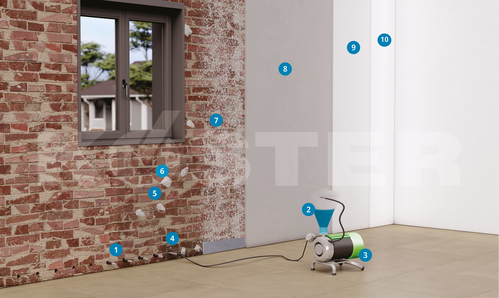 In cases where damage is caused by rising moisture, the old plaster must be removed from the wall. After the installation of a horizontal barrier, apply KOSTER Restoration Plaster. KOSTER Restoration Plaster allows the masonry to dry without damage. KOSTER Restoration plasters are open to vapor diffusion and are hydrophobic. Salts remaining in the wall are absorbed by the KOSTER Restoration Plasters so the salt does not effloresce to the surface and cause damage to the plaster or paint.