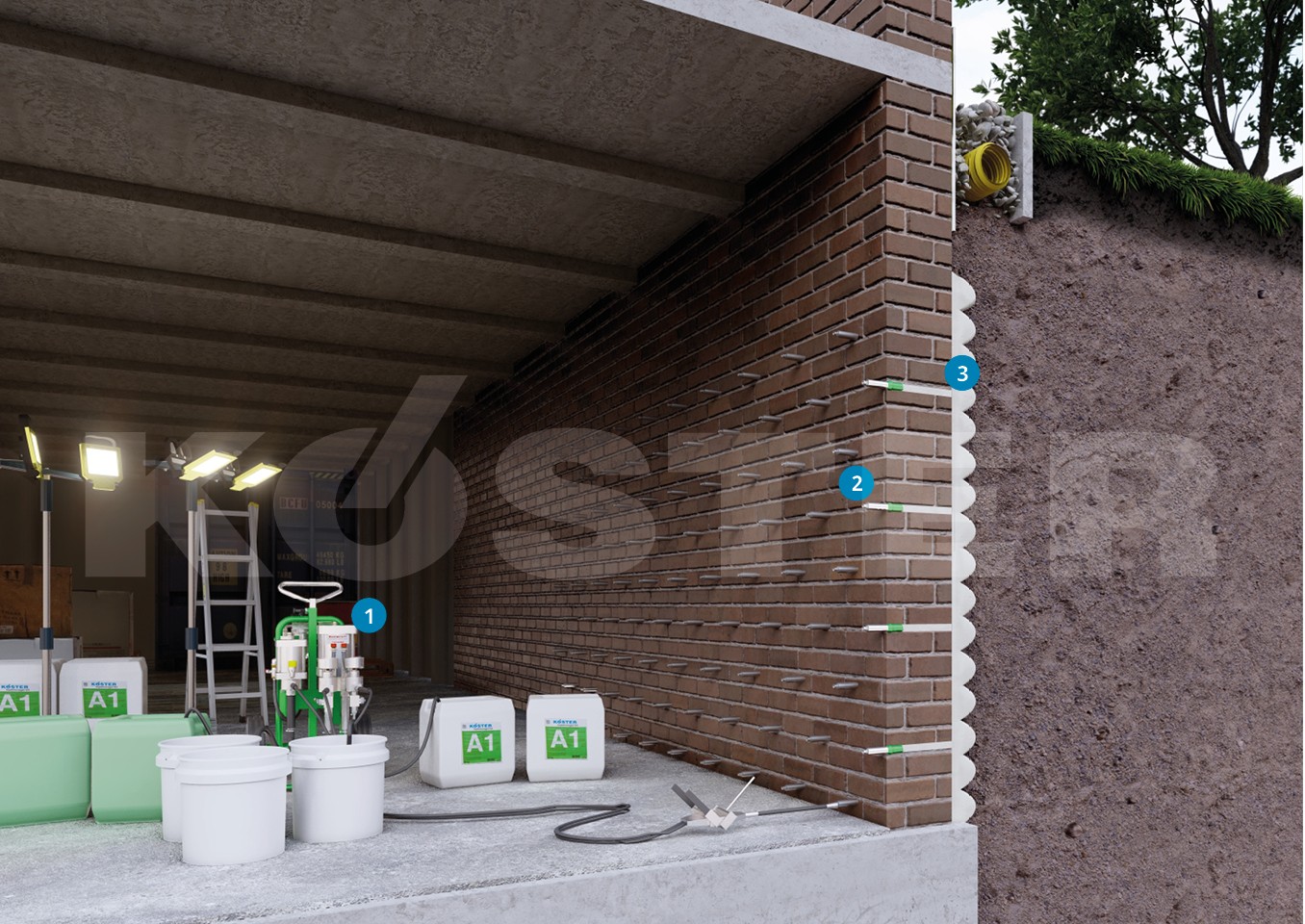 In these cases a curtain injection with KOSTER Injection Gel G4 is possible. The resin is injected through the wall from the inside to the outside. The resin reacts with water and binds it resulting in a waterproof, elastic solid. The injection is carried out with a special two-component pump, KOSTER Acrylic Gel Pump, and through patented KOSTER Distributor Lances. The injection material is dispersed on the exterior wall and in a short time reacts to a waterproofing layer. An alternative method is injecting KOSTER Injection Gel G4 into the building member itself. This so-called “area injection” is possible in porous or hollow building materials. In this case, the KOSTER Injection Gel G4 also reacts with any water present to form a waterproof, elastic solid.