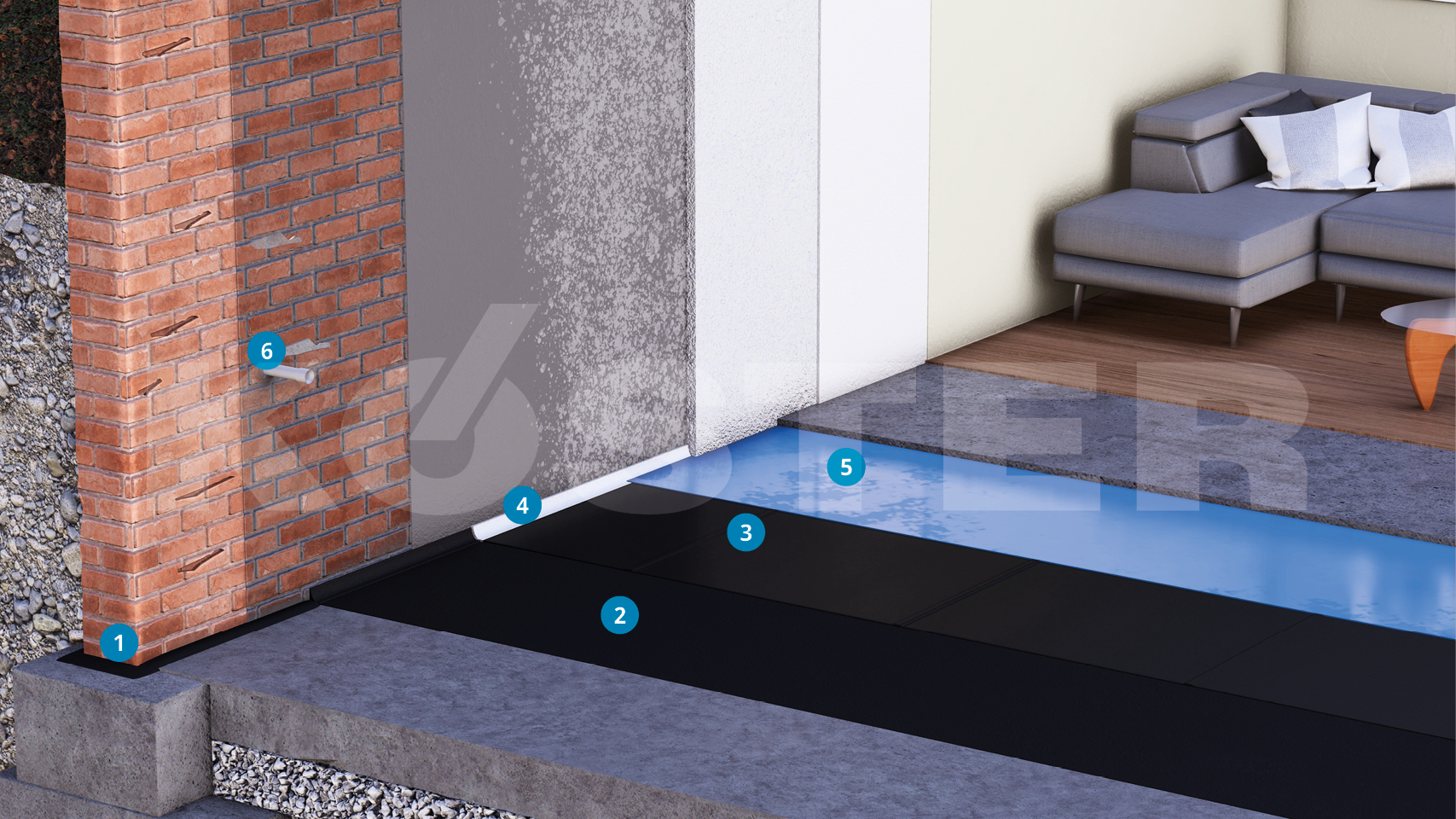 To avoid rising moisture, install a horizontal barrier underneath the wall. At wall/floor junctions, a fillet of KOSTER Repair Mortar Plus must be installed to prevent stresses in the subsequent waterproofing layers.