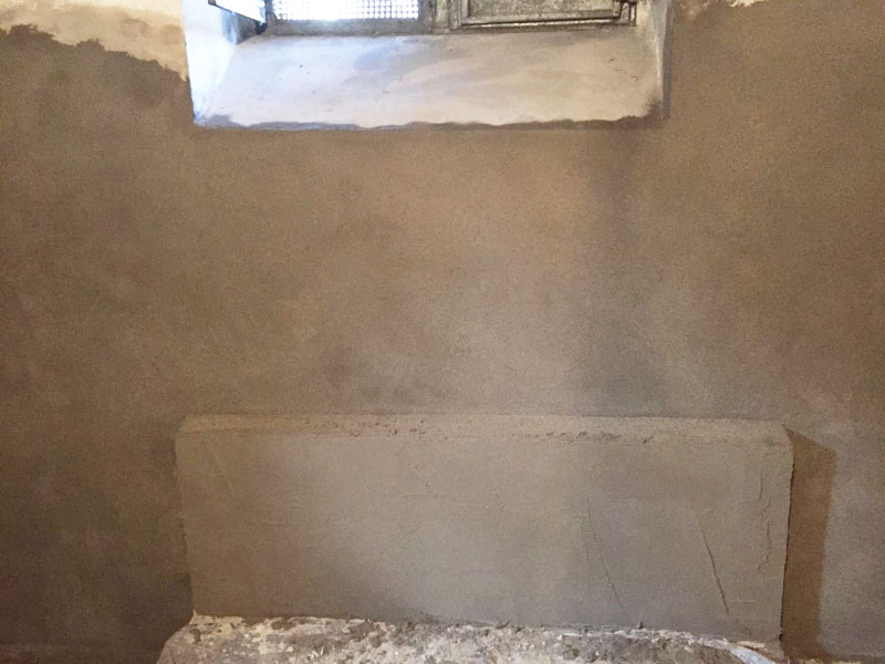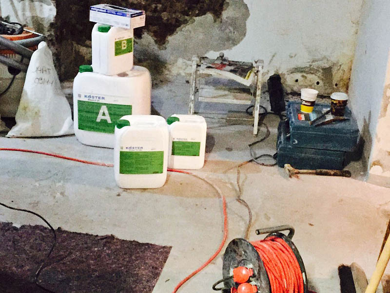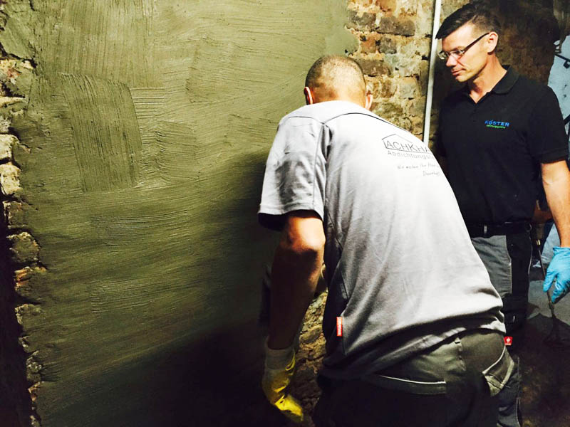 Es wurde eine Horizontalsperre mit KÖSTER Mautrol 2K vorgenommen sowie eine Wandflächenabdichtung mit zementären Abdichtungsprodukten (KÖSTER NB1, KÖSTER Sperrmörtel, KÖSTER Sperrmörtel WU) und anschließend KÖSTER Sanierputz grau leicht durchgeführt.