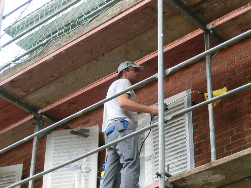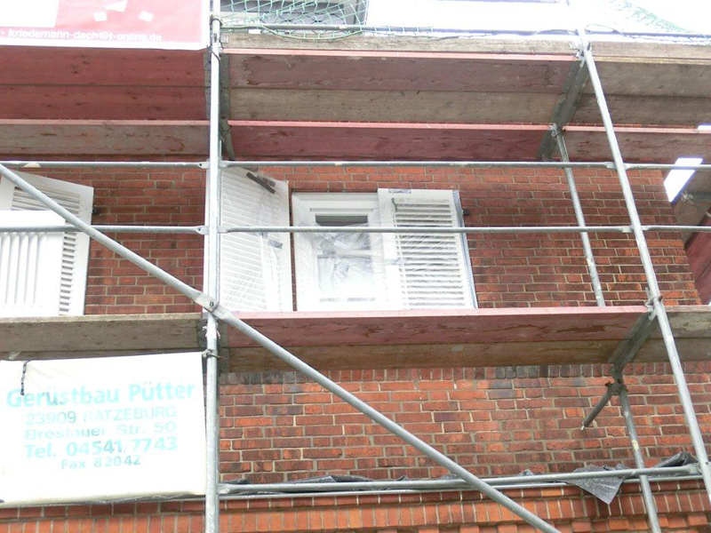 Die Fassade wird mit einem Gerüst zugänglich gemacht, Fenster werden zum Schutz abgeklebt.