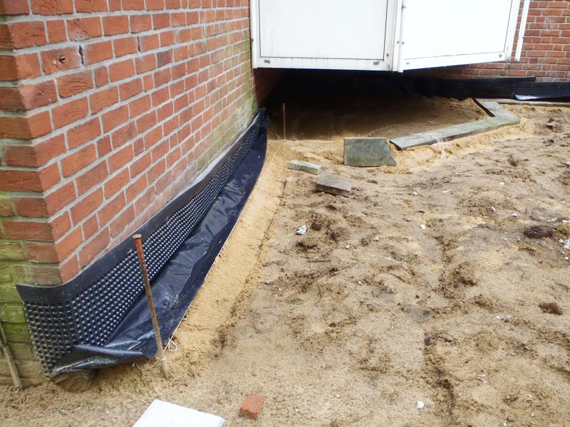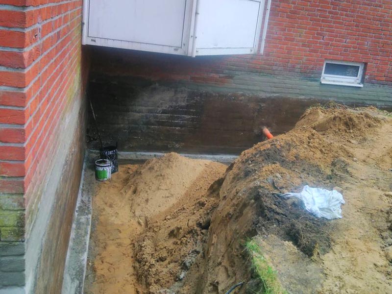 Die vorherige Außenabdichtung war alt und undicht. Der Untergrund wurde zunächst gesäubert und anschließend grundiert. Eine Hohlkehle wurde ausgeführt. Zusätzlich wurde die Sohlenplattenkante gebrochen. Anschließend wurde die Wand mit Bitumendickbeschichtung (Deuxan 2K) beschichtet und mit einer Schutz- und Drainagebahn zum hochwertigen Schutz ausgestattet.