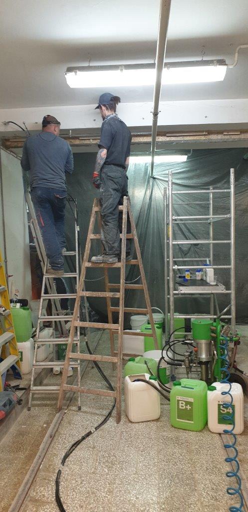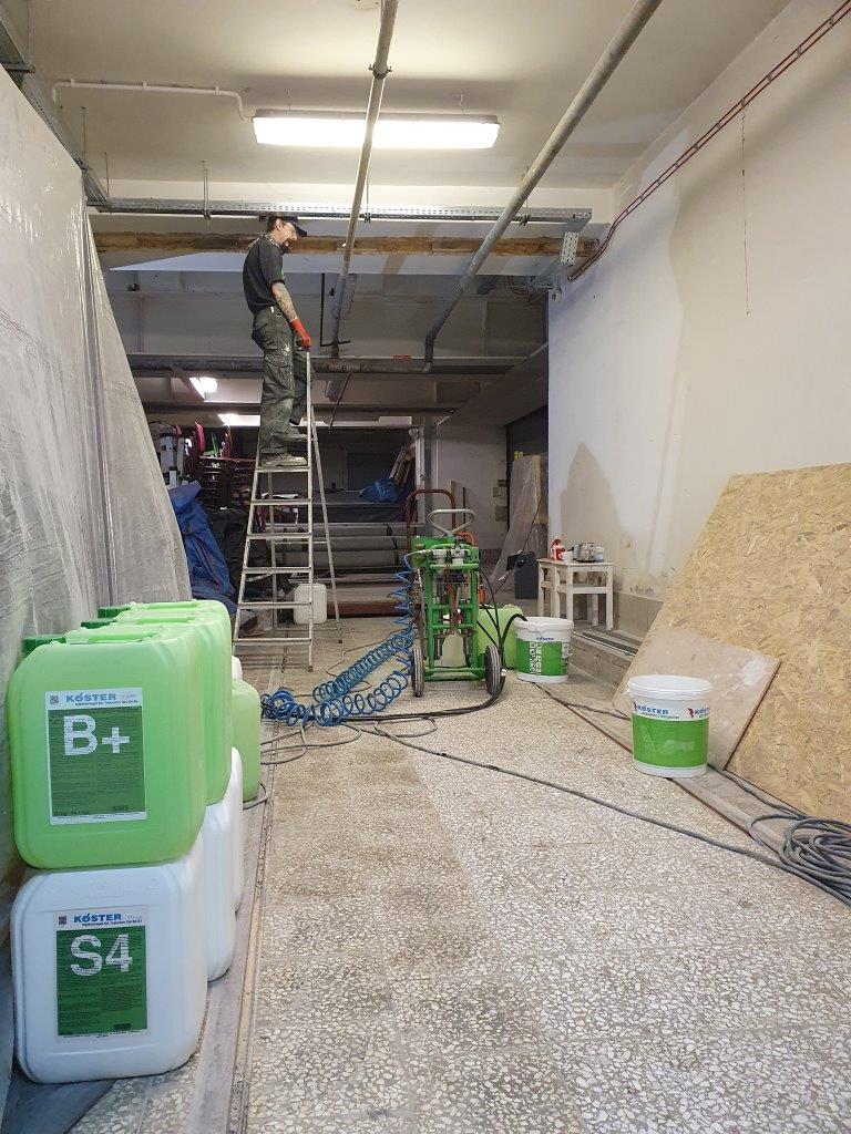 Przez dylatacje między belkami stropowymi nad kondygnacją podziemną przeciekała woda. Dylatacje zostały oczyszczone, zamknięte zaprawą szybkowiążącą KOSTER Sperrmortel, a następnie wykonano iniekcję szczeliny dylatacyjnej żelem iniekcyjnym KOSTER S4, który cechuje regulowany czas wiązania, elastyczność oraz bardzo wysoka przyczepność do brzegów dyylatacji. Przez otwory kontrolne znajdujące się pod stropem podczas iniekcji wychodziło najpierw powietrze a potem żel iniekcyjny. Zastosowano stalowe pakery iniekcyjne KOSTER.