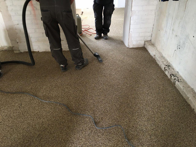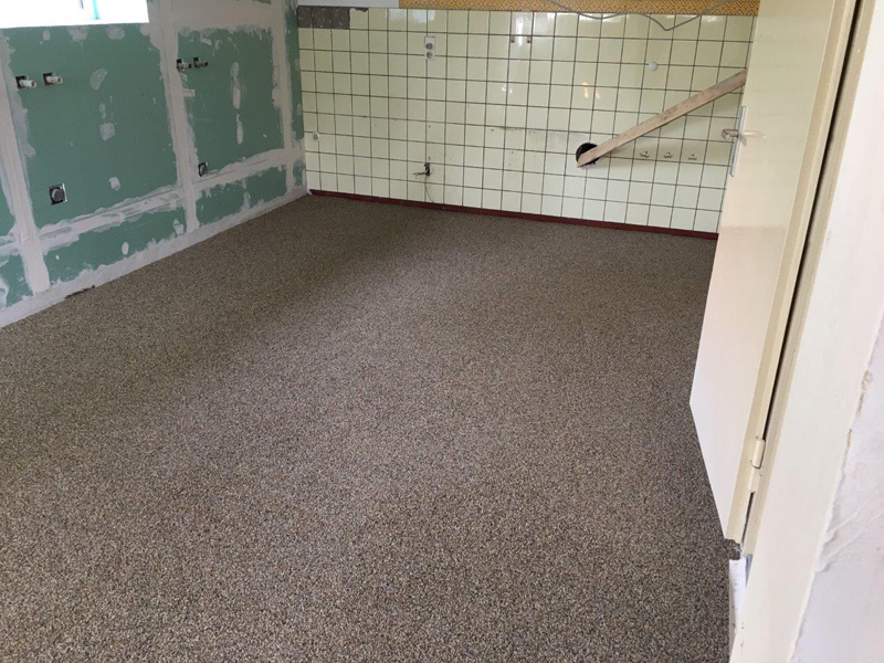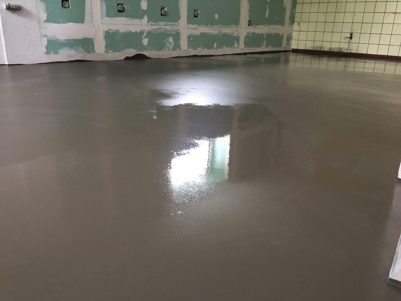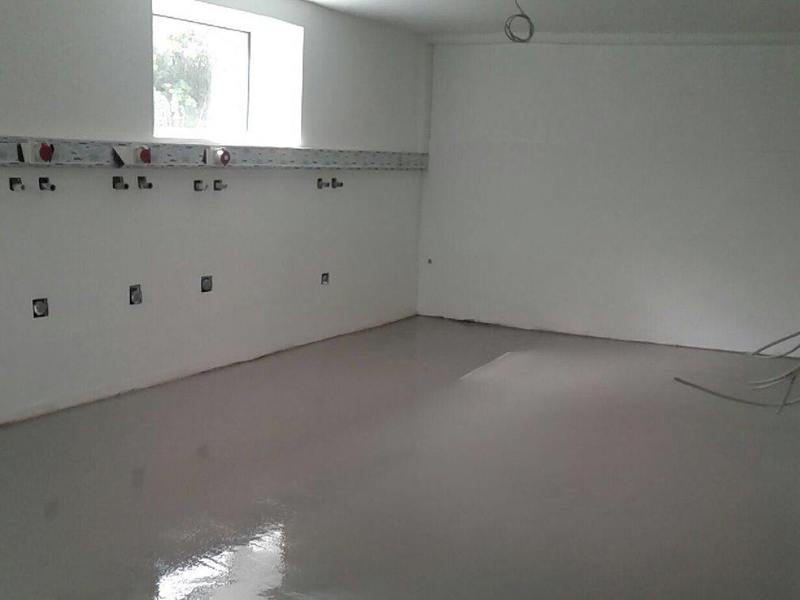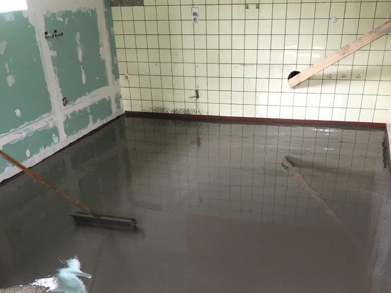 Im Rahmen einer Sanierung sind in den Wänden und dem Fußboden Schäden festgestellt worden. In den Wänden wurde aufsteigende Feuchtigkeit festgestellt. Der Fußboden sollte zukünftig einer Wäscherei dienen. Da auch hier Feuchtigkeitsprobleme vorhanden war, wurde dieser auch saniert. Hierzu wurde auf dem Boden zunächst KÖSTER VAP 2000 I als Dampfbremse aufgebracht. Anschließend ein Epoxidharzgebundener Monokornestrich eingebaut. Als Rautiefenausgleich wurde KÖSTER SL Premium verwendet. Anschließend wurde ein OS 8 Beschichtungssystem mit KÖSTER CT 121 als Grundierung und KÖSTER CT 221 als Versiegelung aufgebracht.