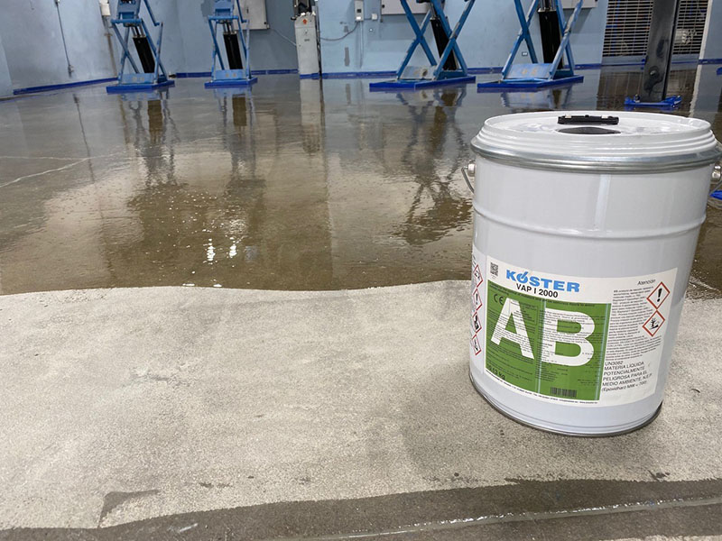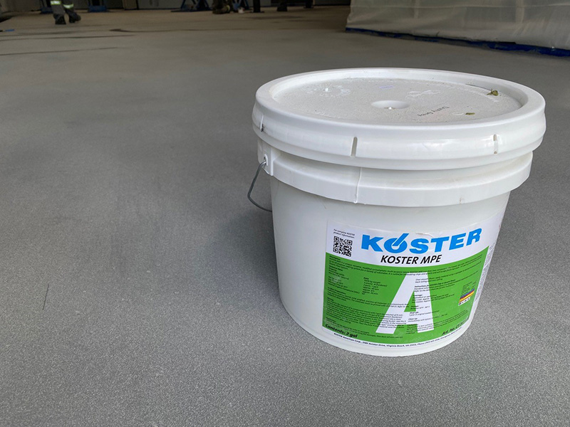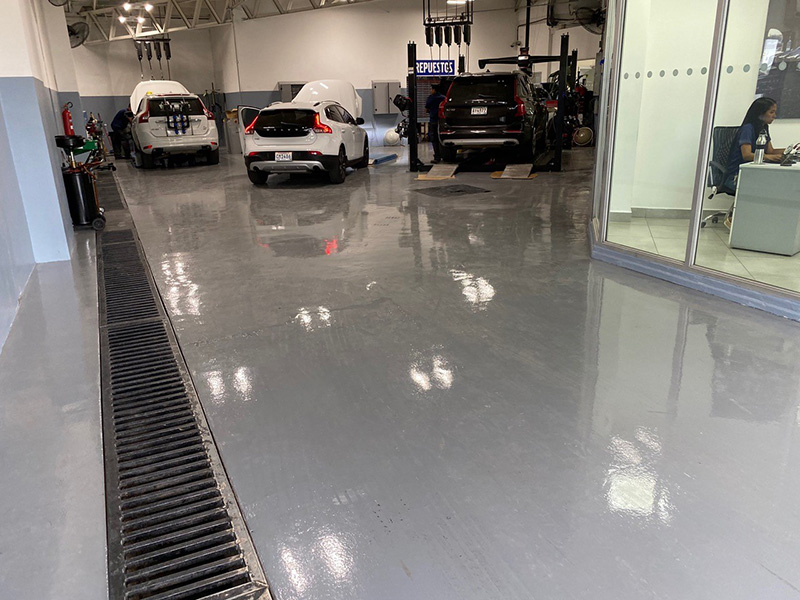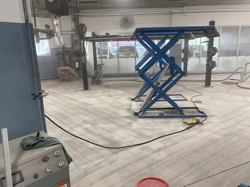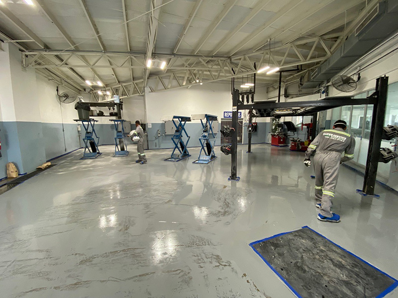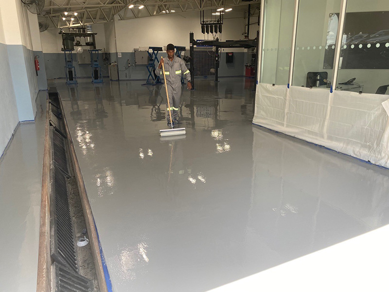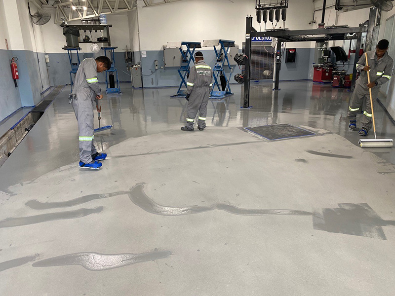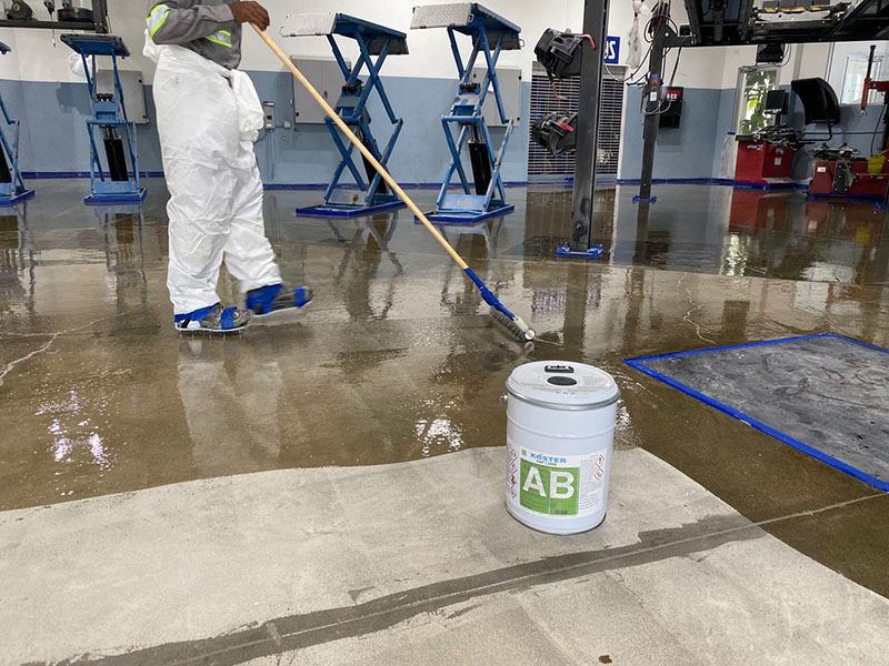 Volvo Dealer required an epoxy floor system for its service center, talk to many supplier and decided KÖSTER floor system with German standard. 180 sqm of concrete floor with many cracks and joints visible, and rather noticeable moister level as a big issue. Surface preparation started with cleaning the whole surface and following that the cracks and joints were thoroughly cleaned. KÖSTER VAP I 2000 mixed with KÖSTER TA, was use to form a paste like mix to fill all joints and cracks .The entire floor was shot blasted to achieve an SSPC-CSP3 profile. KÖSTER VAP I 2000 was them applied with 10, 15 mm thickness. In the next step KÖSTER MPE was applied at 150sqft/gl average, and back rolled and after drying the second layer was applied at 80sqft/gl. After one day, KÖSTER UTC was spread out with squeegee, and back rolled. The whole refurbishment took place in 4 days.