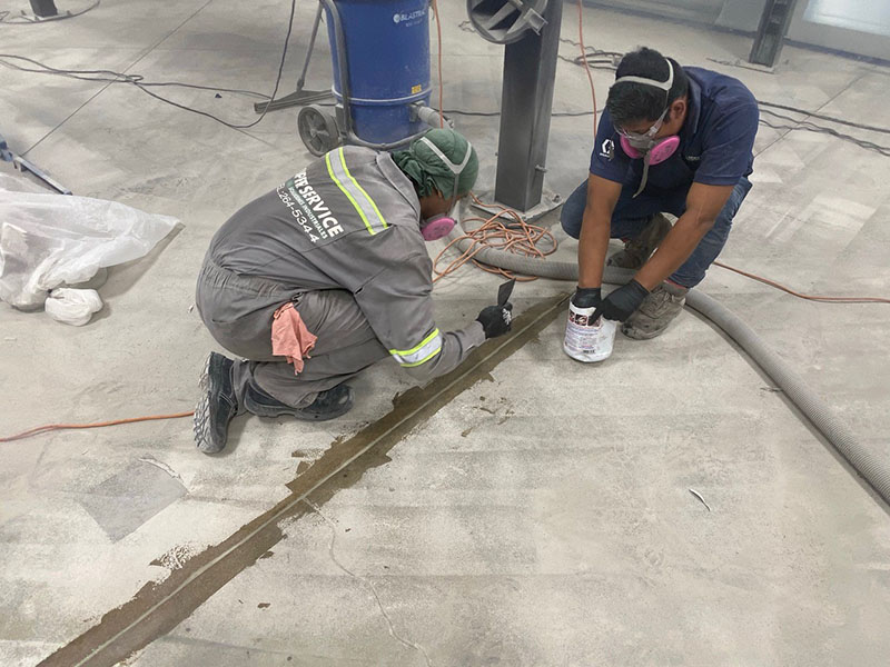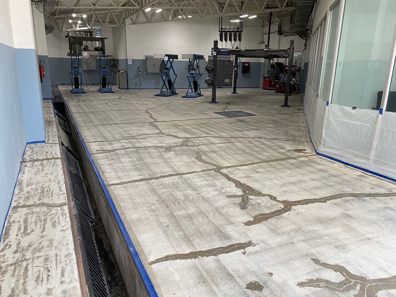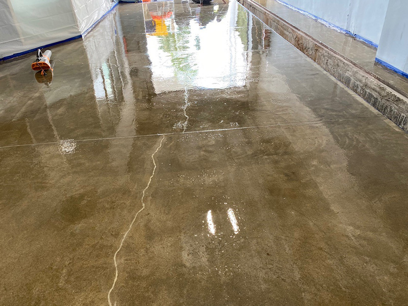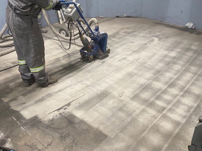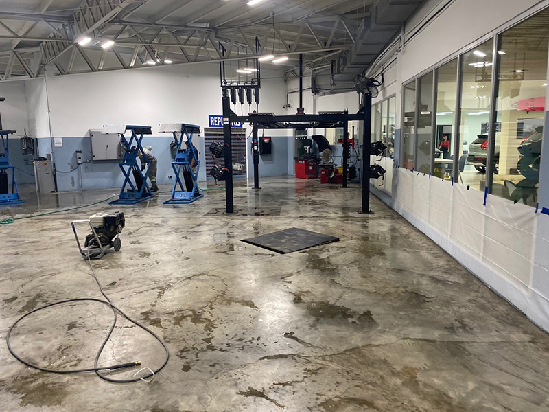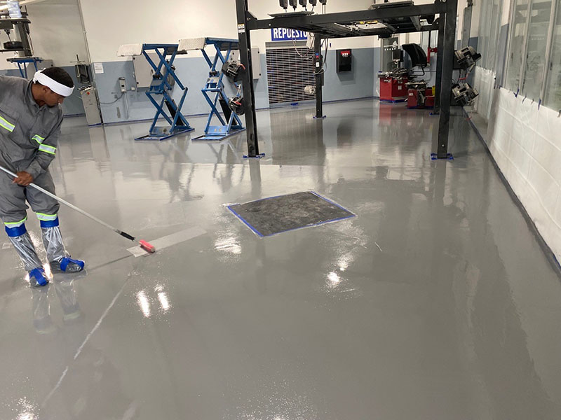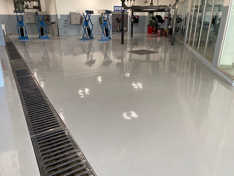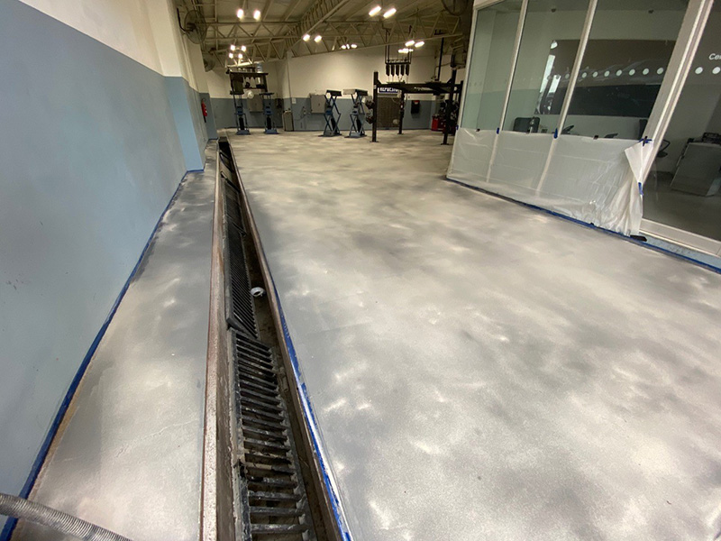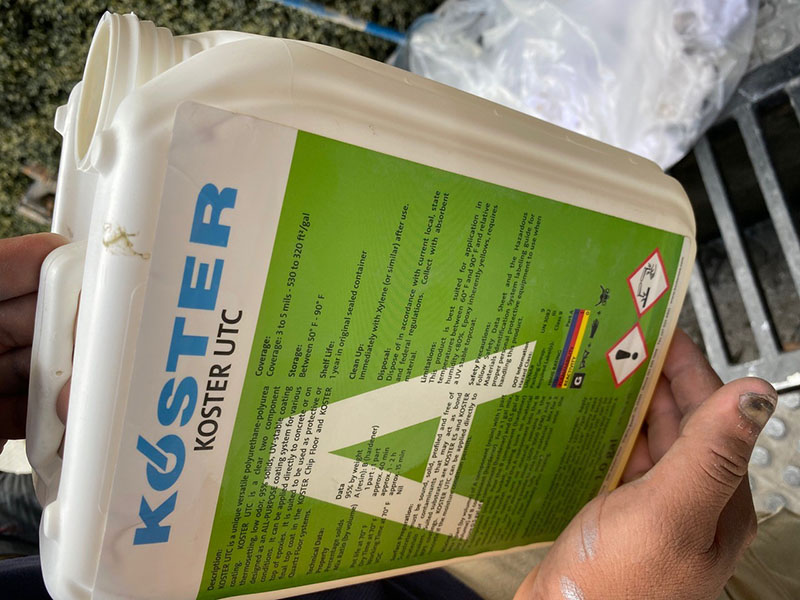 Volvo Dealer required an epoxy floor system for its service center, talk to many supplier and decided KÖSTER floor system with German standard. 180 sqm of concrete floor with many cracks and joints visible, and rather noticeable moister level as a big issue. Surface preparation started with cleaning the whole surface and following that the cracks and joints were thoroughly cleaned. KÖSTER VAP I 2000 mixed with KÖSTER TA, was use to form a paste like mix to fill all joints and cracks .The entire floor was shot blasted to achieve an SSPC-CSP3 profile. KÖSTER VAP I 2000 was them applied with 10, 15 mm thickness. In the next step KÖSTER MPE was applied at 150sqft/gl average, and back rolled and after drying the second layer was applied at 80sqft/gl. After one day, KÖSTER UTC was spread out with squeegee, and back rolled. The whole refurbishment took place in 4 days.