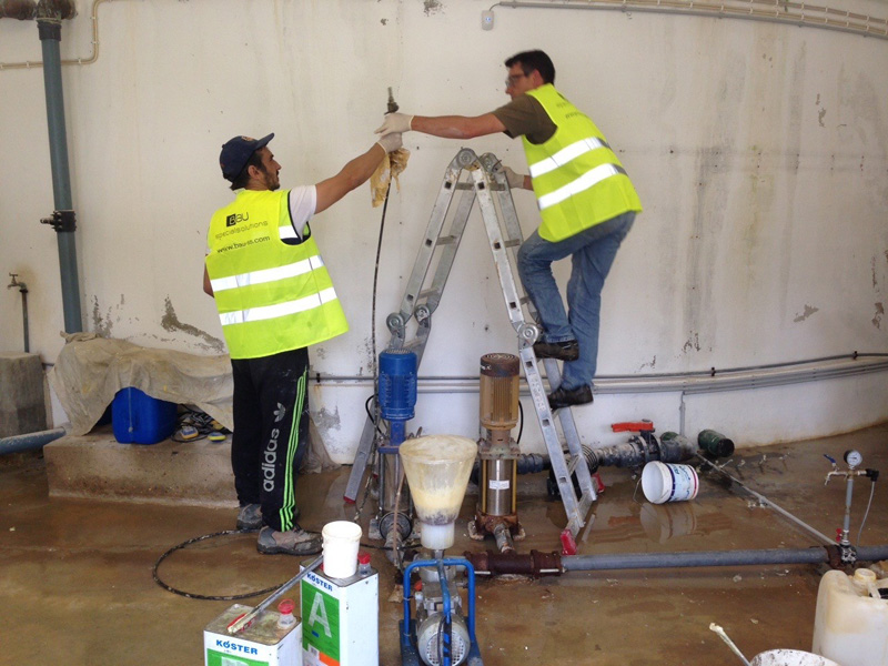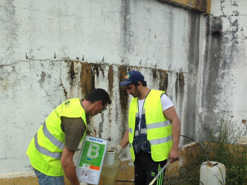 PU Injection with KÖSTER Injection Resins. Injection of cross section crack on concrete water reservoir from the outside.