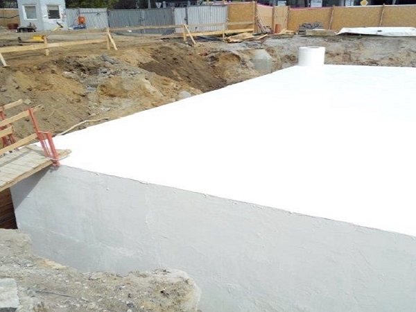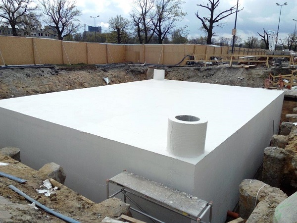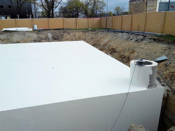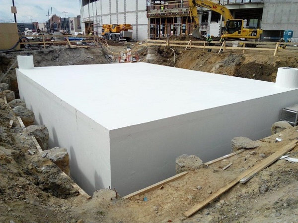 Uszczelnienie dna i ścian zbiornika wody deszczowej od wewnątrz i na zewnątrz za pomocą KÖSTER 21 z wtopieniem w narożach siatki Flexgewebe. Fasety wykonane materiałem KÖSTER Sperrmortel.