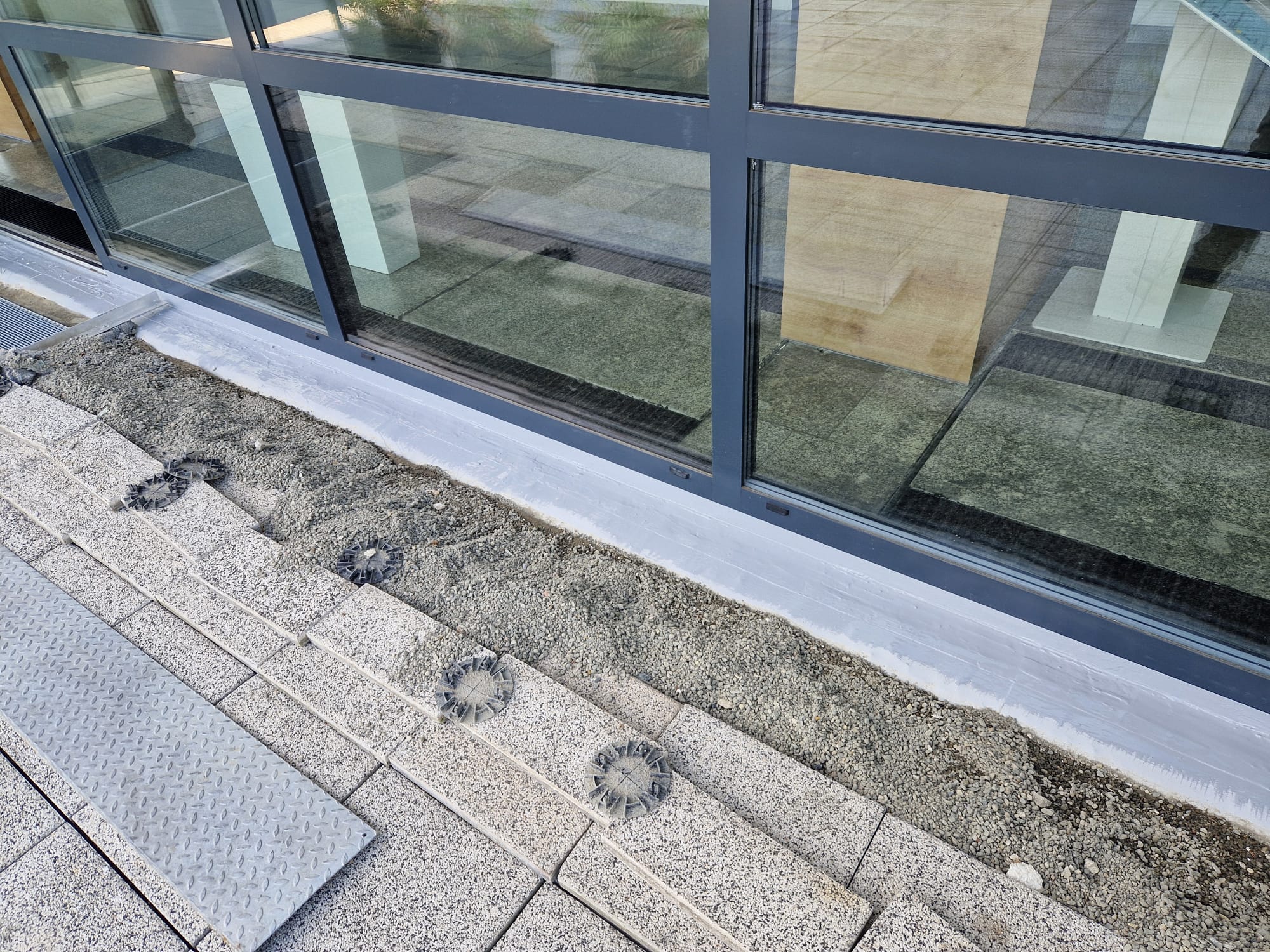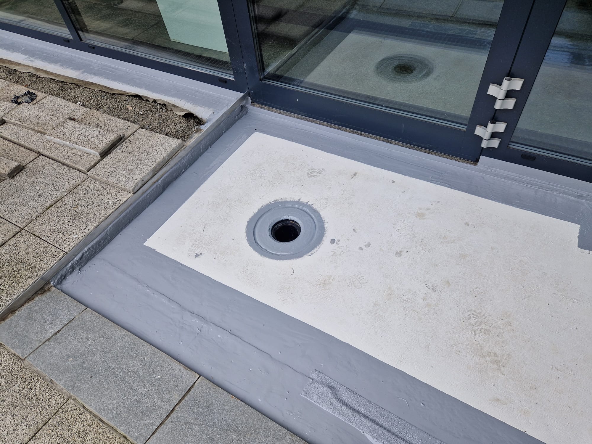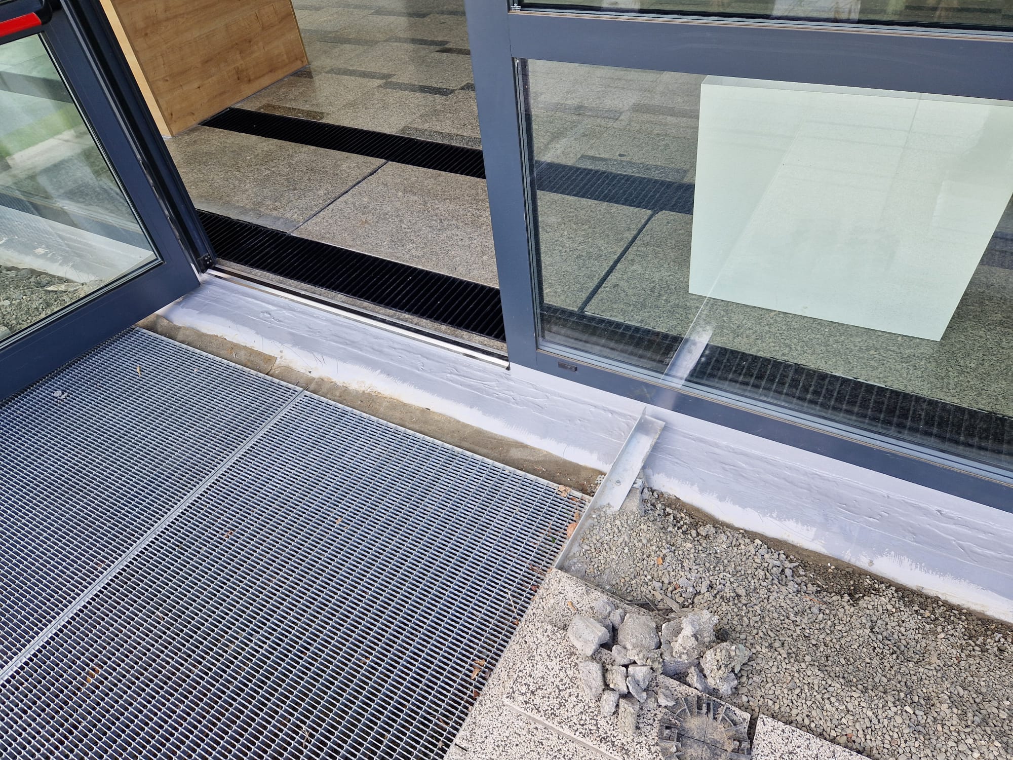 Doszczelnienie styku stolarki i odpływu wycieraczki na stadionie Akademii Wychowania Fizycznego w Krakowie. Zastosowane materiały: KOSTER 21, POLYSIL TG 500, MS Flexfolie, PU Primer 120, CT 121, Superleece