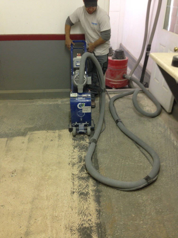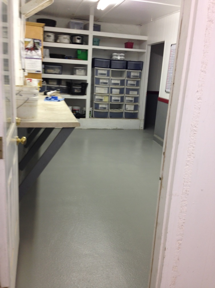 Princess Anne Farm is a stable that offers boarding and training to horse and rider. The flooring of a saddle storage room and a feed rooms had to be replaced. The old coating was removed and the concrete was prepared by shot blasting. The edges along the wall were ground. The prepared concrete surface was very rough. The unevenness in saddle storage room was levelled by installing KOSTER UC 200 ¼ in thick. This layer was overcoated with KOSTER UC 300 to achieve a medium skid resistance. The feed room received a scratch coat of KOSTER UC 100 in order to level the unevenness. After that coat had cured, it was overcoated with a self levelling layer of KOSTER UC 100 which received a KOSTER Quartz 40 broadcast. To lock the broadcast in, it was overcoated with KOSTER UC 300. The resulting surface provided the medium skid resistance which was required.
